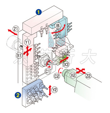| 四、斯大走心機SR-38typeB為了進一步實現多樣化復合加工,充實了背面側的功能,從而在背面刀架臺配備8軸鉆孔單元,并搭載Y2軸控制作為標配,在刀架臺上備有可通過操作系統控制的角度可變化的B軸動力單元,使得刀具可在工件外圓和端面上任意角度加工傾斜表面。 | |||