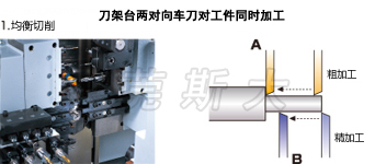 | 三、斯大走心機SR-38typeB采用門型刀架臺采用均等負荷橫向導向結構,抑制直動導軌軸承所受的力矩負重至最小限度,確保刀架臺剛性,并在門型刀架臺的后面排刀座附加X3控制軸,通過X1、X3軸同步控制實現對工件進行均衡切削,抑制工件偏轉實現高精度加工,縮短切削時間。 |
