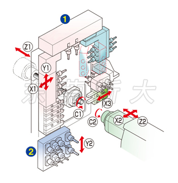 | 三、斯大走心機(jī)SR-38typeA采用門型刀架臺采用均等負(fù)荷橫向?qū)蚪Y(jié)構(gòu),抑制直動導(dǎo)軌軸承所受的力矩負(fù)重至最小限度,確保刀架臺剛性,并在門型刀架臺的后面排刀座附加X3控制軸,通過X1、X3軸同步控制實現(xiàn)對工件進(jìn)行均衡切削,抑制工件偏轉(zhuǎn)實現(xiàn)高精度加工,縮短切削時間。 |