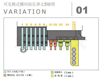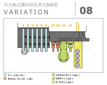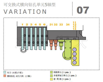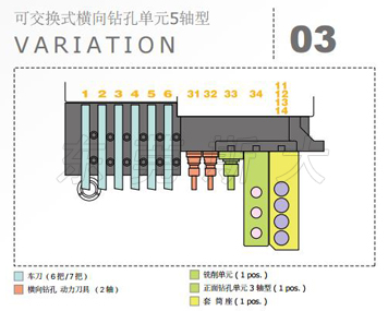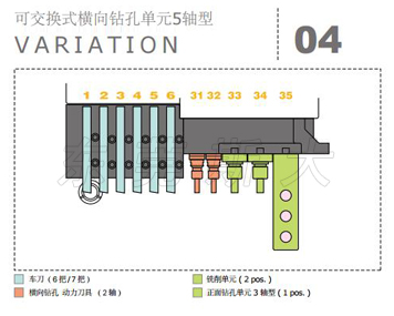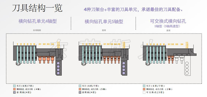 | 斯大走心機SB-R系列設計了橫向鉆孔單元4軸型、橫向鉆孔單元5軸型、可交換式橫向鉆孔5軸型、可交換式橫向鉆孔5軸高速型4種型號的刀架臺結構,其中可交換型橫向鉆孔5軸型和5軸高速型通過自由組裝最佳的刀具配備,豐富的刀具單元最多可驅動30多把刀具,實現多樣化復合加工目的的最佳境界。 | |